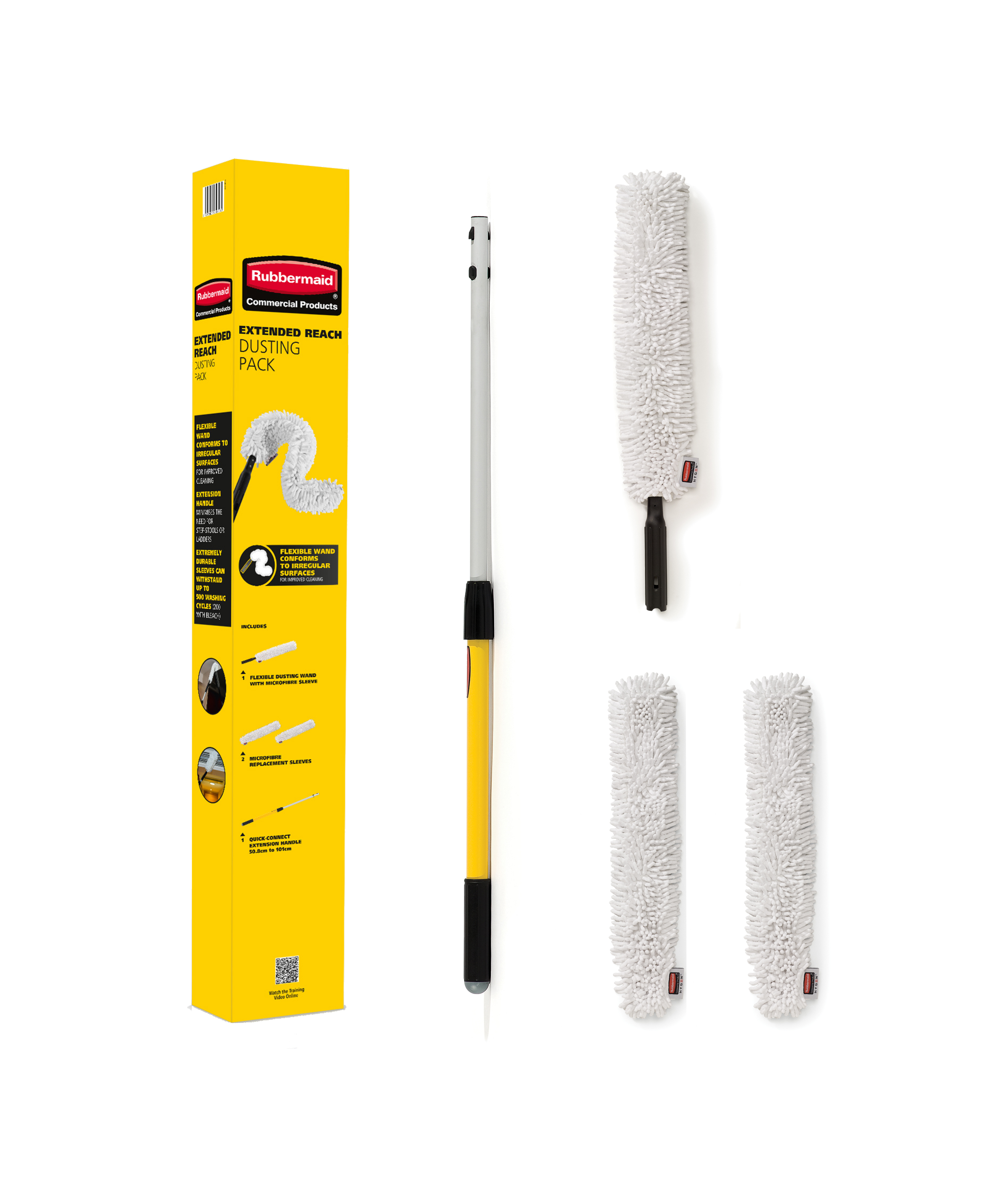 Rubbermaid HYGEN Extended Reach Cleaning Pack Patented arc shape draws dirt and debris to the centre for better pickup. Frame flexes to clean both contoured and flat surfaces. Quick connect extension handle minimises the need for stepstools and ladders.